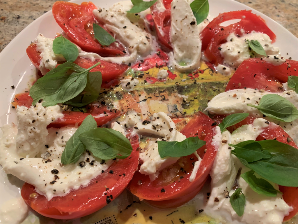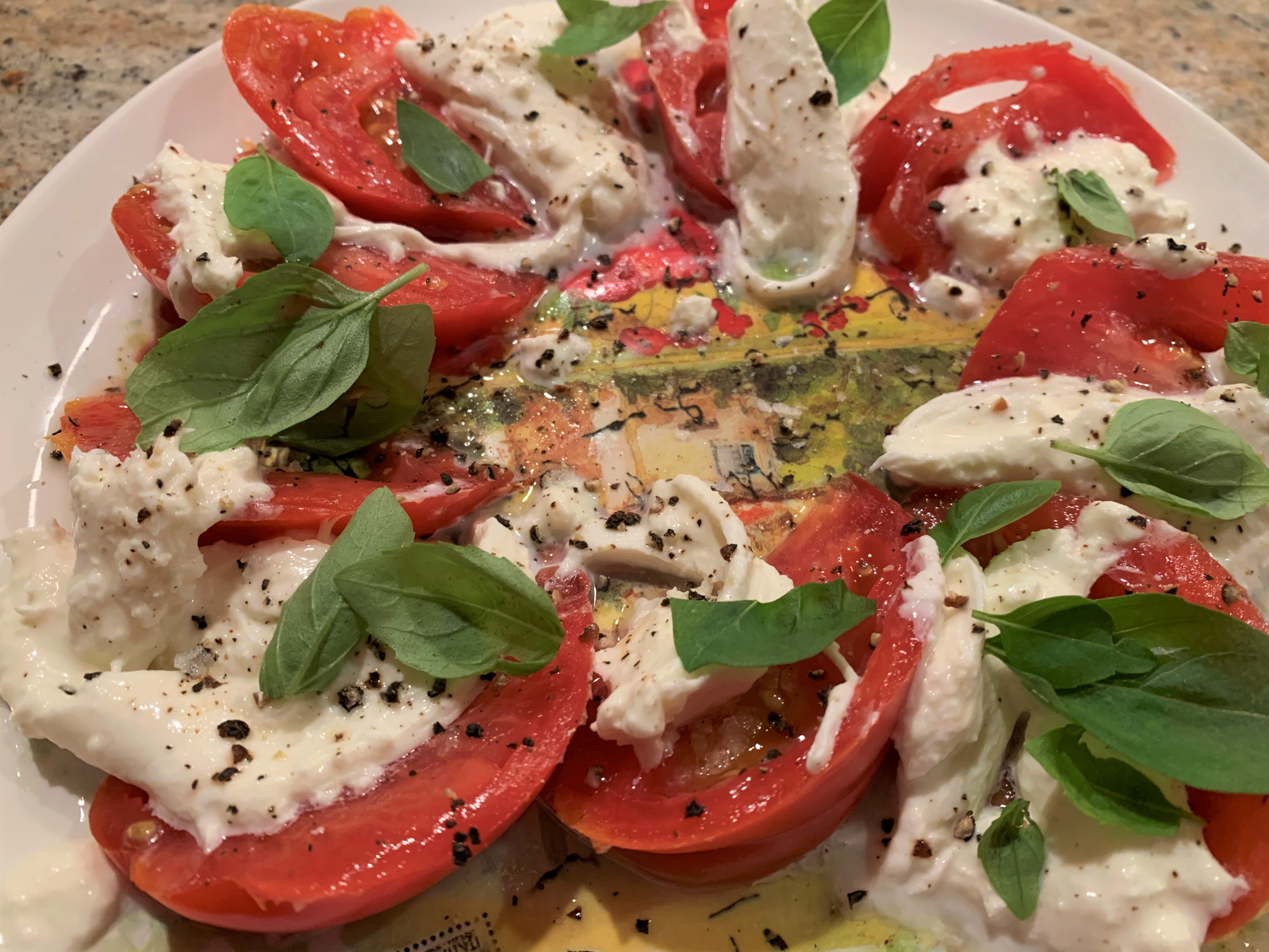 Note: It is still just possible (this was written two weeks ago) to get hold of good tomatoes in Western Pennsylvania – our better, large tomatoes don’t start coming in until late August. This recipe, which we cooked sometime recently, was too good not to share. And, since the tomatoes are cooked, this will be good with high-quality (expensive) tomatoes at any time of year.
