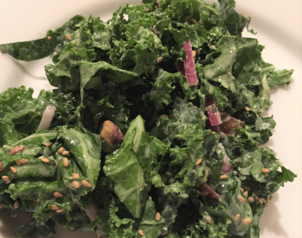 KALE SALAD WITH DATES, PISTACHIOS AND GREEN TAHINI