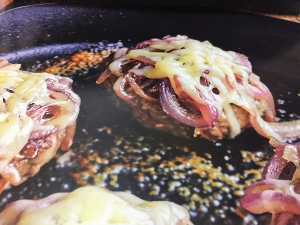 Now heat a large cast-iron skillet (one that can hold all the burgers with space between them) over medium to medium-high.  [If you have high-btu burners you’ll want to back off a little or you’ll burn the burgers.]  Add 1 ½ tablespoons of oil.  Now add the burgers directly from the freezer pressing each one firmly into the pan with a metal spatula (smash them a little).  Cook for about 3 minutes, without moving so that the bottoms get well-browned.  Flip the burgers and, as quickly as you can, place the onions and the grated cheese on top of each one.  Place a lid on the skillet and cook for about 2 minutes, until the cheese is melted and burgers are medium rare.