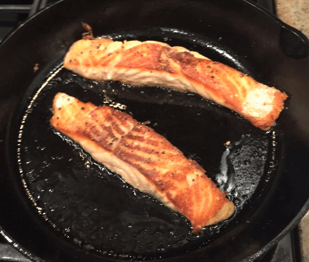 Reduce heat under skillet to medium high. Place salmon in the pre-heated skillet rounded (skin) side down and cook for exactly 2 minutes (DO NOT MOVE). Use a large spatula to turn the fillets over – the rounded side should now be up – and put the skillet into the preheated oven for about 4 minutes. Cover the skillet loosely with aluminum foil and let the salmon rest for about 4 minutes for medium-rare or 5 minutes for medium.