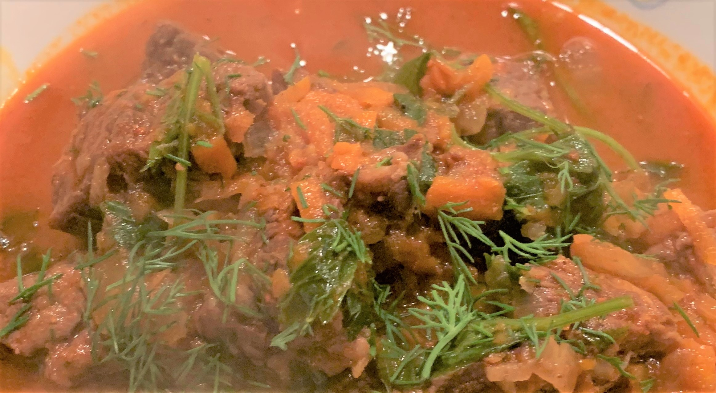 Get parsley and dill out. Mince the parsley stems, but hold off chopping the parsley leaves or dill until the beef and other vegetables are nearly cooked.