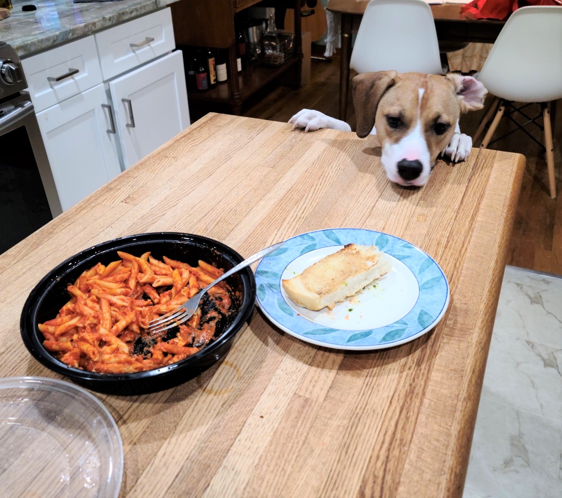 Arlo, Billy and Emily’s dog, hankering for some garlic bread