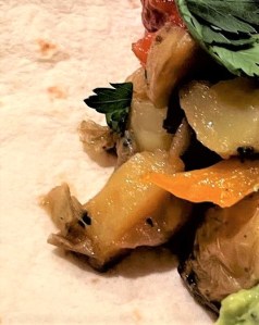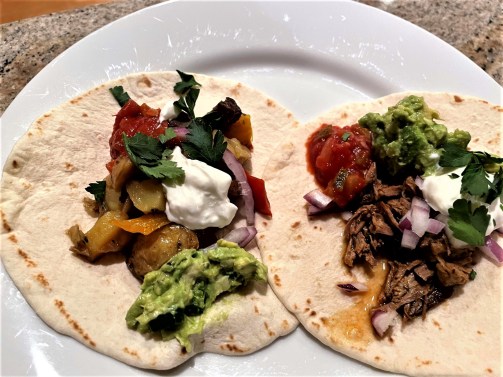 Last Sunday, Rick, Beez and I had some excellent New York Strips. But without the other guests we’d planned on, try as we might, we could not finish those babies. So, on Monday, with green, red and yellow bell peppers, and some parboiled new potatoes and a lot of onion and a little beef stock and powder of dried porcini and a little cumin and salt and pepper, we created a hash so good that we used it as a filling for our Cinco de Mayo tacos on Wednesday.