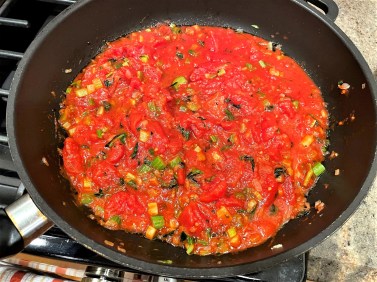 I usually begin by getting a good sear on the protein – especially if it’s chicken. Simply cook it in some butter and olive oil (neutral oil for chicken). Our steak already had a good crust, so I cooked it briefly, to impart a little beef flavor and fat into the oil. Remove the beef, chicken, pork or lamb to a separate plate.