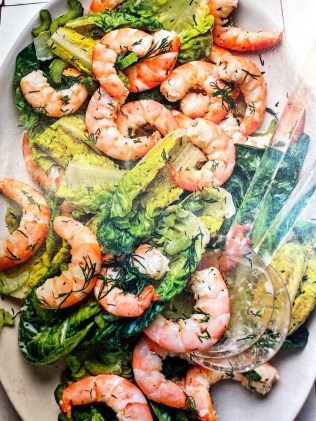 Arrange the lettuce on a platter and spoon the shrimp mixture on top. Top with more dill.