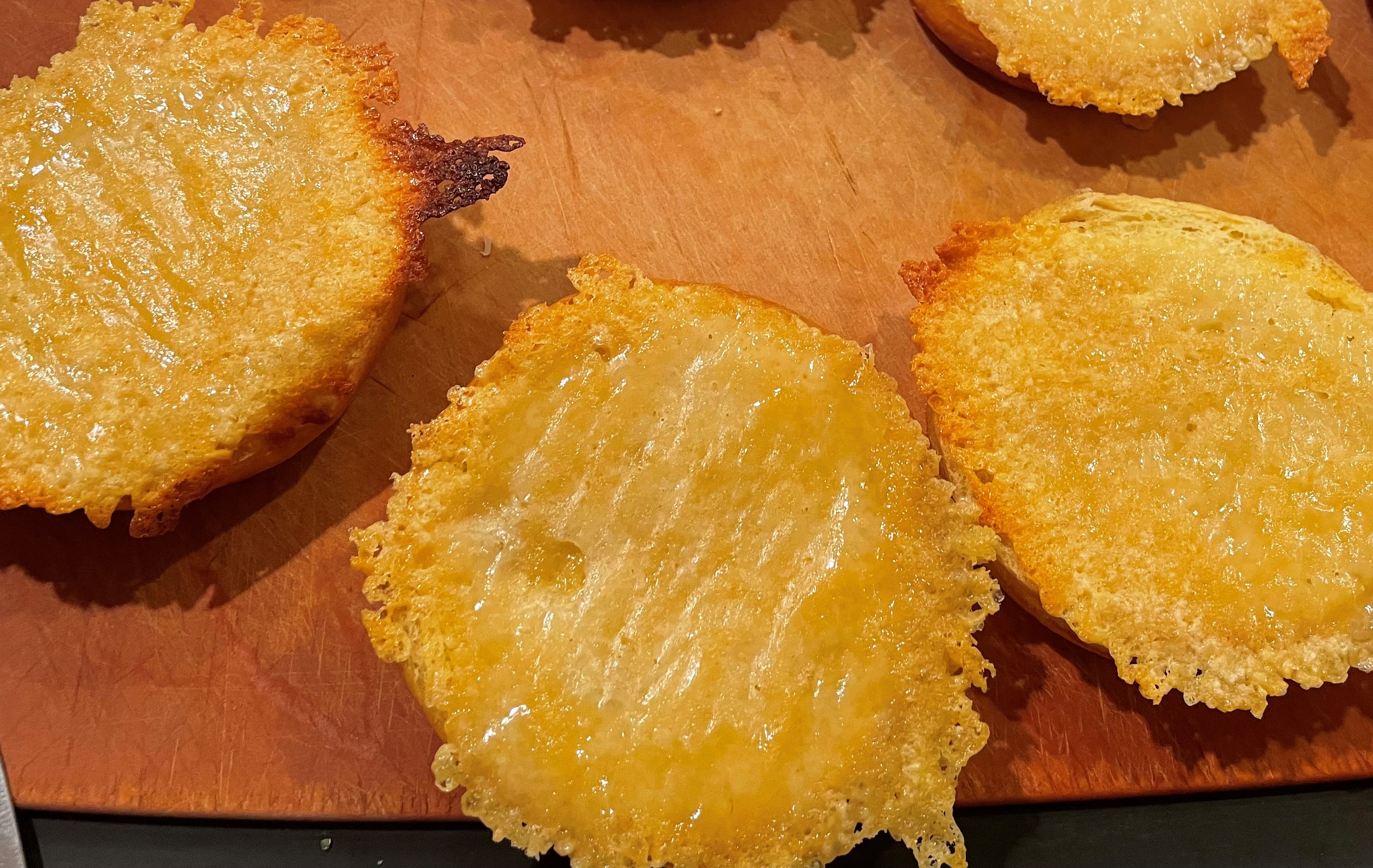 Alas, no picture of the whole burger – but here are the brioche buns with a crust of melted gruyere. You’ll want to this.