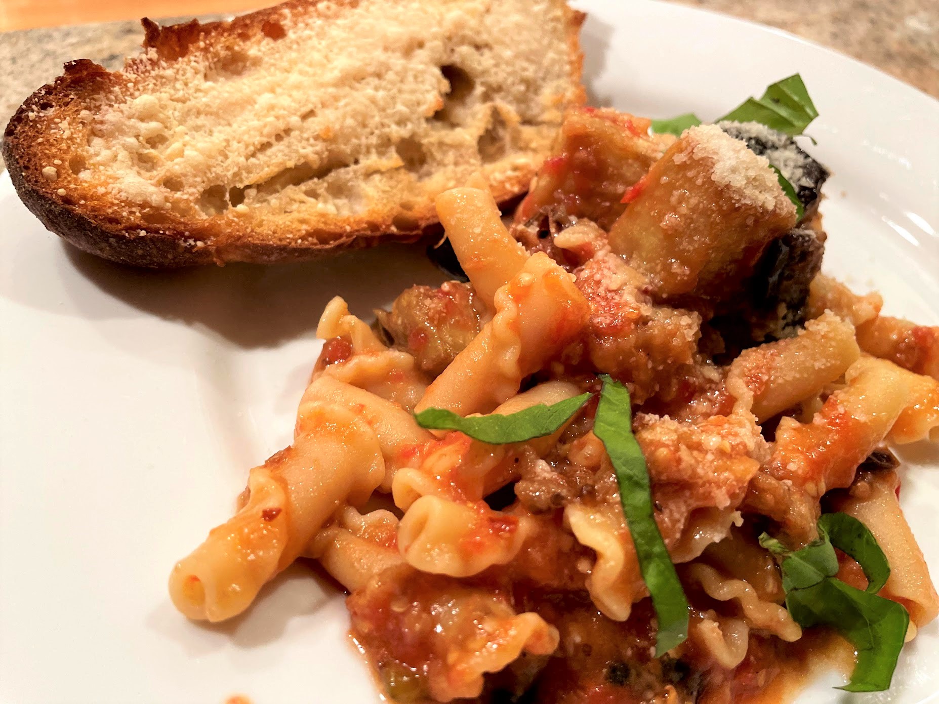 No picture of the chicken – but here’s a fetching photo of the pasta with eggplant we had two weeks ago