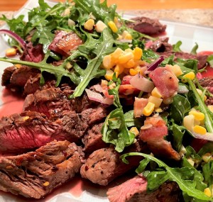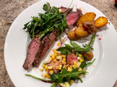 Put the steak into the panini pan and sear (don’t move) for 5 minutes, after placing the lid of the panini pan on top of the steak and pressing down. The steak should be medium-rare at this point. Cook some more or remove from pan, cover with foil and rest for 5 minutes. You can reheat the corn salad if you need to.