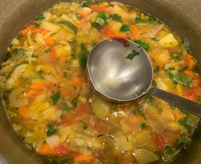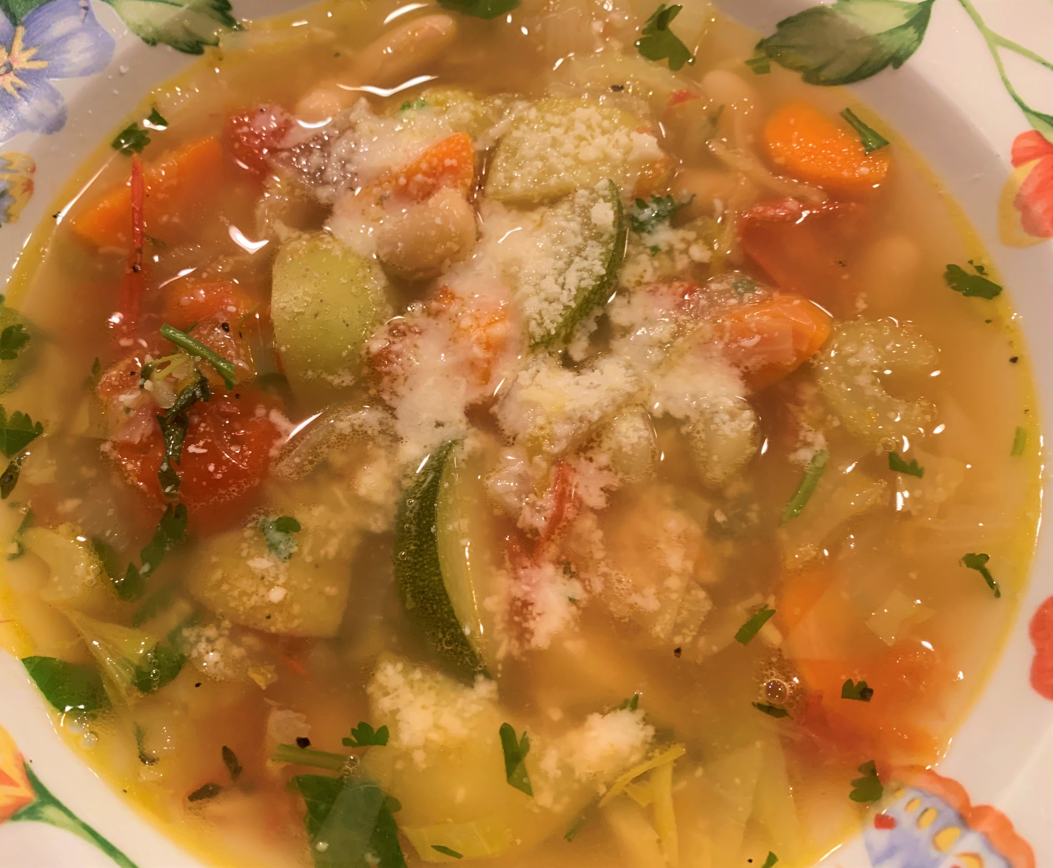 But let’s face facts: A diet of pure carbs will not fly in this day and age and She-Who-Must-Be-Obeyed certainly wouldn’t countenance such a peasant-based approach to nutrition. So, if you’ll take a little more advice, why don’t you cook up a pot of minestrone soup to go with that bread? If you have my instinctive objection to popular opinion, you might object that vegetables and broth are a nod to the fashionably slim among us – but it turns out, once you get past your not unreasonable prejudice, they’re awfully good in their own right.