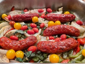 When you can handle the peppers, remove the skin – you can do this by hand if you’ve roasted them well. A little running water can help here – you can rinse the skins from your fingers. Now slit the peppers and remove the seeds and ribs and stem and place them in the bowl of a blender or food processor. Add the vinegar and blend until smooth. Slowly add 4 tablespoons of olive oil. Taste and season with salt and pepper.