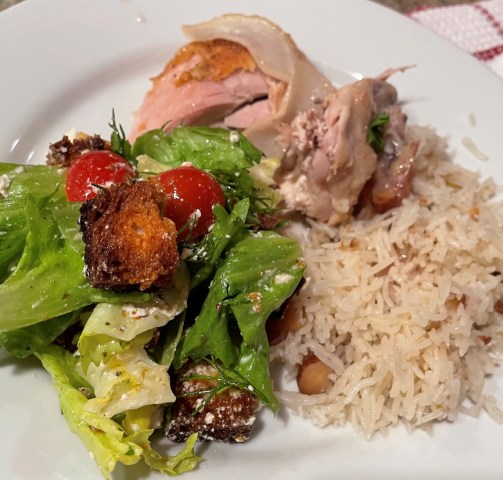 Sunday:                       Jeffrey’s Roast Chicken with Rice Pilaf and Creamy Feta                    Panzanella with Oregano Dressing