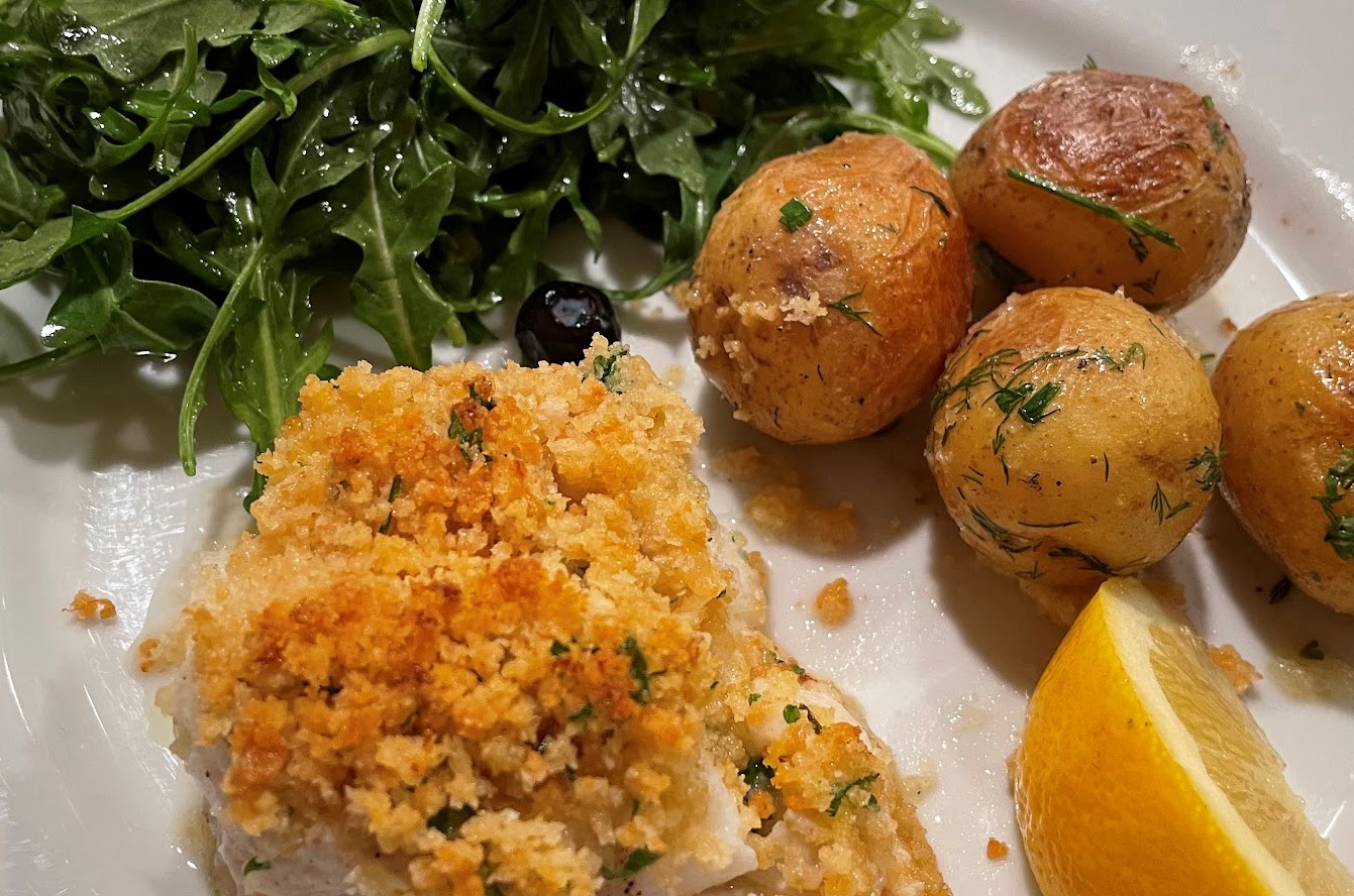 Friday:                         Baked Cod with Herbed Crust and Lemons