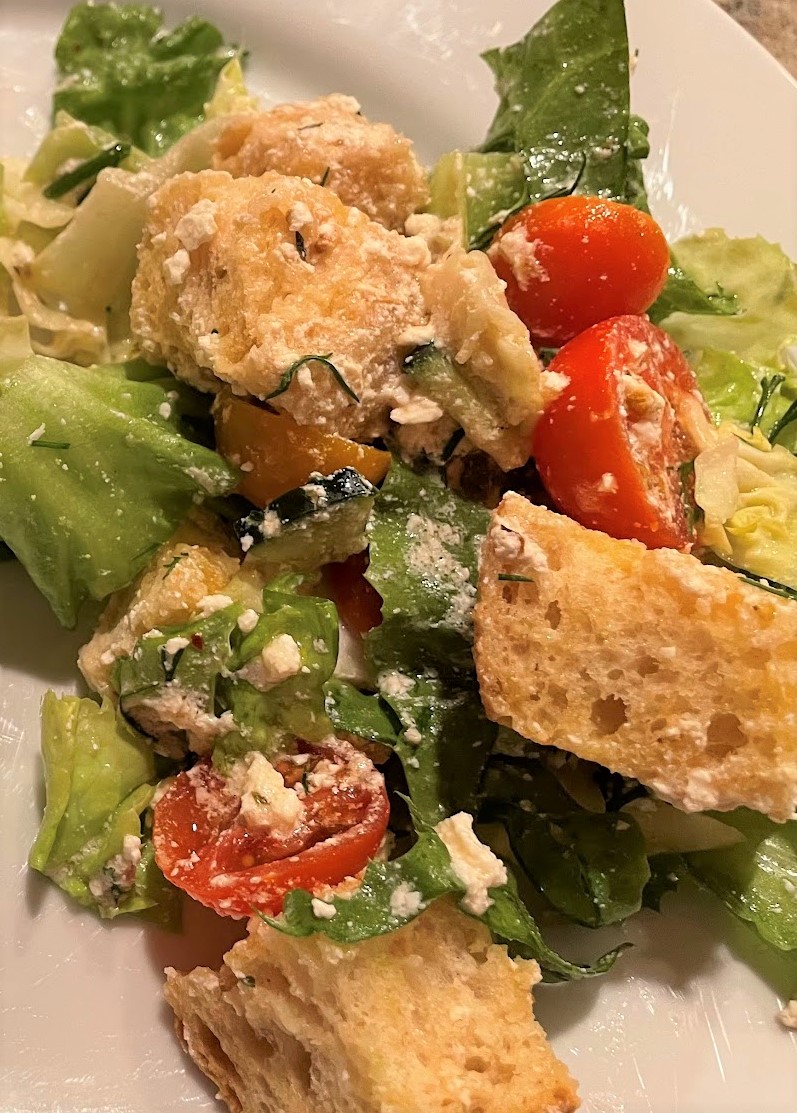 All (well, most) kidding aside, the salad we’re going to offer you is on beyond substantial, involving croutons, feta cheese, tomatoes, oregano and other seasonings, and the wonderfully meaty, slightly bitter lettuce known as escarole.