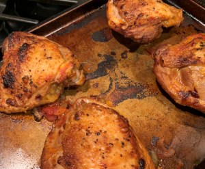 My twist: Heat the broiler while the chicken is braising and after resting the chicken, put the thighs directly under the broiler for a few minutes to re-crisp the skin. You might want to reheat the sauce while this is going on.