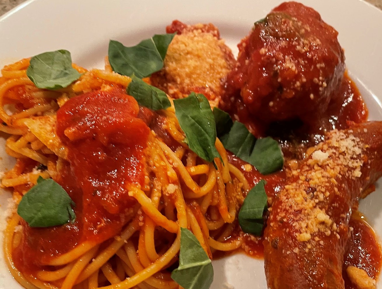And here’s a contemporary version of Mom’s Chicken Cacciatore with my own twist on developing a really crisp skin. It takes just a bit of cooking, and you have to allow time for the chicken to braise. My suggestion is that you do what the hunters in Italy did while waiting for their rabbits to cook – drink wine or grappa, tell jokes and recount old, but enhanced stories about the past and relax, which is pretty much a description of how we all acted at Beez’s birthday party.