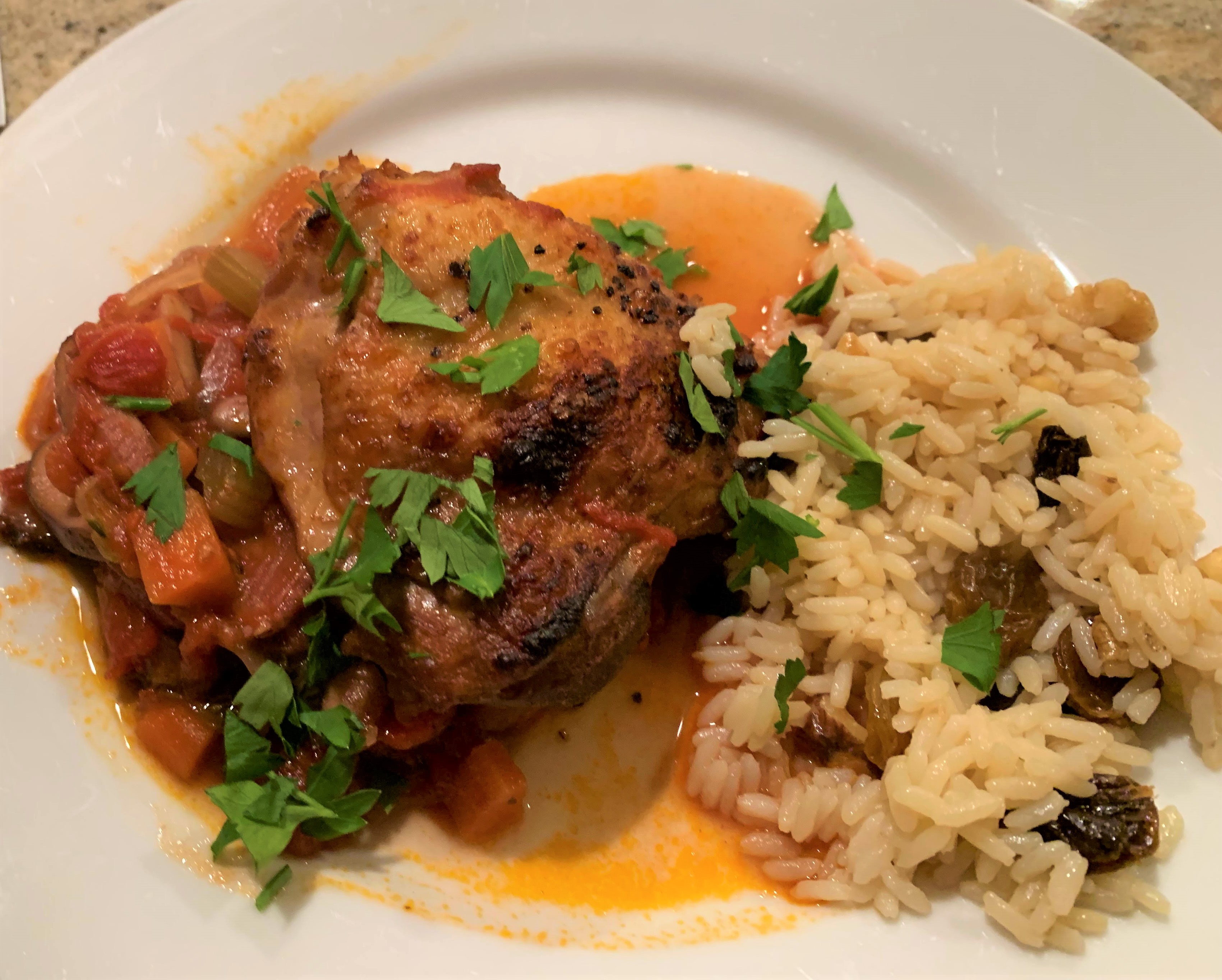 Serve with braised greens, polenta or rice. We used Uncle Ben’s cooked with chicken broth and butter and added broken-up walnuts and raisins just before serving.