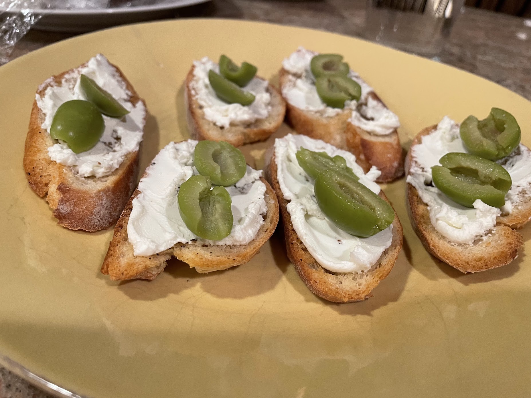 After baguette slices have cooled, spread with goat cheese, top with halved olives and grind a bit more pepper over the whole deal.
