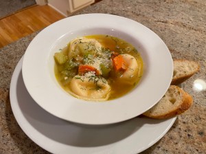 *Hilda’s dinner on the Tuesday before last, Ceil’s English Trifle, Ina Garten’s Ravioli en Brodo and our own – near perfect – recreation of a Philly Cheese Steak (yes, it had Cheese Whiz).