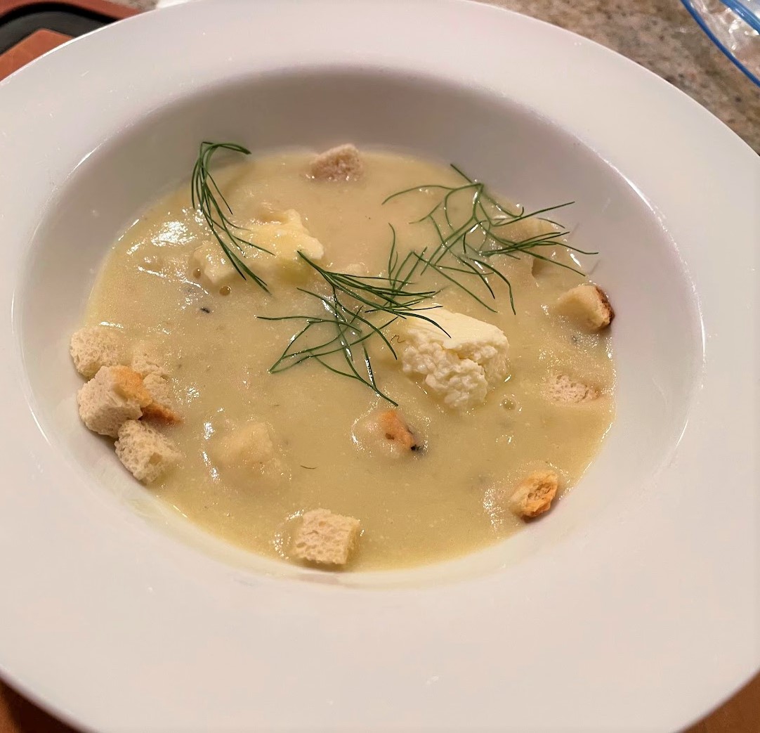 Serve, garnished with the sliced banana pepper and with the dumplings and cucumber salad.