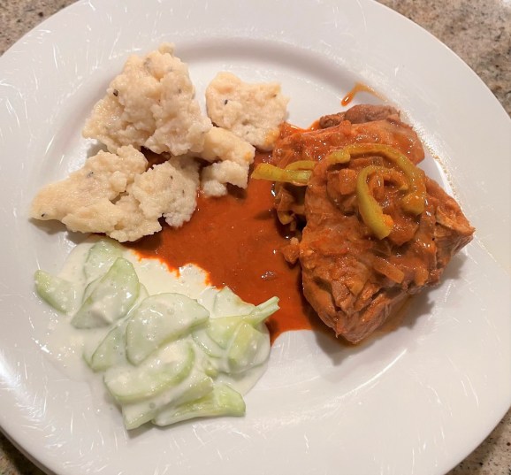 Sunday: Chicken Paprikash with dumplings and Sour Cream and Cucumber Salad.