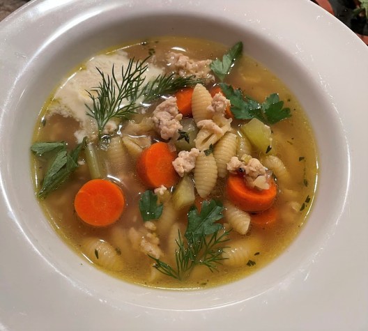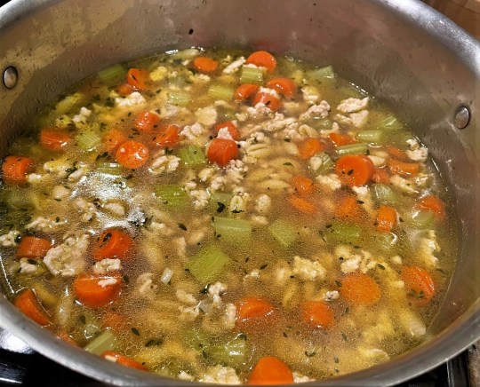 Not bad at all – in fact, wonderful.  And it turns out that if you want to get a lot of chicken flavor into the broth of your soup quickly, ground chicken is the way to go – more surface area to pick up and impart flavor?  It didn’t hurt that the weather in Pittsburgh was brutally cold – the sort of cold that freezes your brow walking across the parking lot to the grocery story.  You need some chicken soup on a day like that.