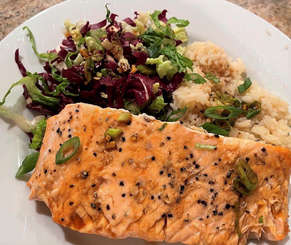 Friday:                       Roasted Salmon with Miso Rice, Cabbage Slaw, and Ginger-Scallion Vinaigrette
