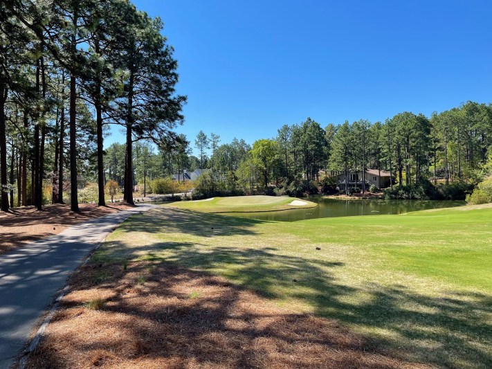 A par 5 at the Country Club of North Carolina – you can’t see that the fairway continues to the left, below the pine trees, giving golfers the choice of hitting a third shot across the pond to the green or bailing out to the left.