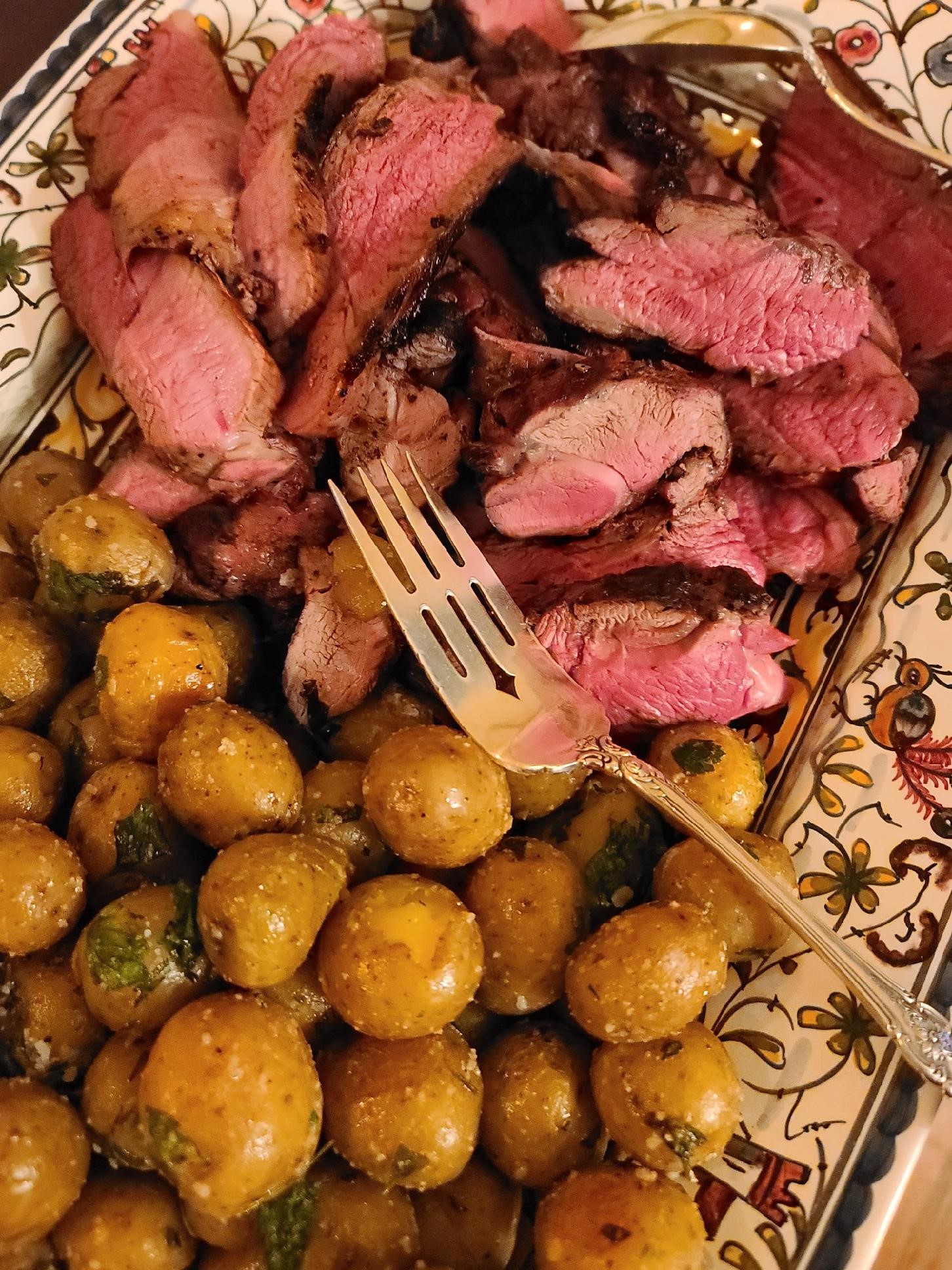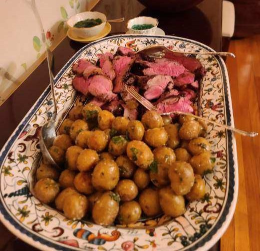 Sunday: Grilled Butterflied Leg of Lamb, Parsley Potatoes, Salad, Appetizer of Chicken Liver Paté with Cornichons on Baguette