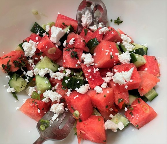 Combine the watermelon, cucumber and scallions in a large bowl. Pour on the dressing and toss to combine, then sprinkle the feta over salad and serve.