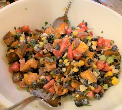Well, I’ll leave you to ponder that. As for Beez and me, we had two salads in the last week that can serve both as side dishes and main courses: 1. The refreshing Watermelon and Feta Salad, full of flavor and, as our friend, Father Drew informed us last night, electrolytes. [You might want to have a burger or a brat or a chicken cutlet along with this salad.] 2. The rich and satisfying Sweet Potato and Black Bean Salad, also useful as a side dish but plenty hearty as a main course.