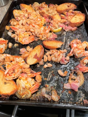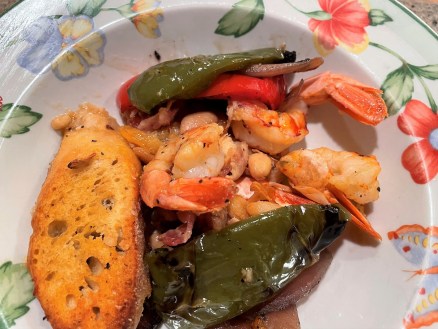 And now back to those shrimp. Shrimp are up there with hamburgers, pizza and breakfast cereal in terms of universal consumption. I remember, as a child, adoring fried shrimp. But there are so many great ways to indulge in shrimp – cooked, chilled shrimp with cocktail sauce,* the irresistible scampi, shrimp and grits, shrimp creole, in a bouillabaisse or a cioppino. But let me suggest a new way to handle this ubiquitous arthropod– roasting the shrimp along with good crusty bread, cannellini beans (optional) and a bit of garlic, salt, and chili flakes and then serving the whole mix in a shallow bowl. The bread (stale bread works really well here) soaks up the juices from the cooking shrimp and the oil. Leaving the tails on the shrimp gives them a lot of flavor, some of which soaks into the bread. Honestly, I could have eaten just the bread and been happy. Oh we also tossed in some peppers and onion we had grilled a few days before – all of which took about 15 minutes to cook. The prep for this dish takes about 10 minutes to thaw the shrimp and 10 to let them soak in cold, salted water and plump up and 5 to pat them dry and in 40 minutes you can have a spectacular dinner for your loved ones, guests, fellow inmates, vagabonds or whomever.