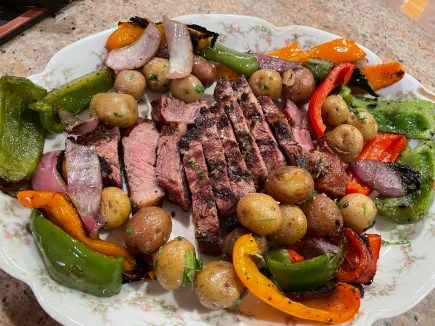 Monday: Grilled Strip Steaks, Zucchini Gratin, Cucumber Salad, Polenta Pound Cake with Orange and Peach Glaze
