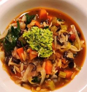 Let me suggest that you keep up the meat-and-potatoes diet if you’re a professional athlete, a hands-on farmer, telephone lineman, lumberjack, pearl diver or marathoner. But if your job consists of sitting at a desk, looking at a computer screen, or driving or flying around the country to have ‘meetings,’ give the meat and potatoes a rest from time to time, and try a salad or, for something substantial, this week’s recipe – Winter Minestrone with Cabbage Pesto. Add some nice crusty bread and you’ll have a meal that will give you the energy you need to move that cursor or speed-dial that customer or keep your fingers nimble enough to deal with the TV remote-control and perhaps give you the stamina to perform a ‘search’ on Smart-TV with those lighter than a feather controllers that squirt out of your hand like a bar of soap.