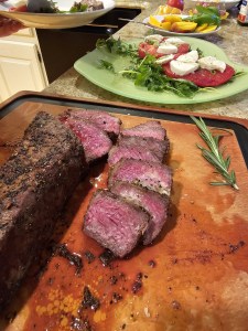 After that not-very-enlightening footnote, let’s get back to Ina and steaks.  Ina has perfected a rub that will have you selling your collection of steak sauces and eating beef more often than is good for you.  (Except for Gail, who does not eat things with faces, but who is not at all pushy about it.)  The key ingredient of this rub is coffee – just the regular grind you keep on your counter.  Add a little brown sugar, salt, pepper, red pepper flakes and granulated garlic and you have a magic ingredient that will produce a wonderfully savory piece of meat.  You will have to follow Ina’s instruction on how to cook this steak, but that’s easy, because here’s the whole process: