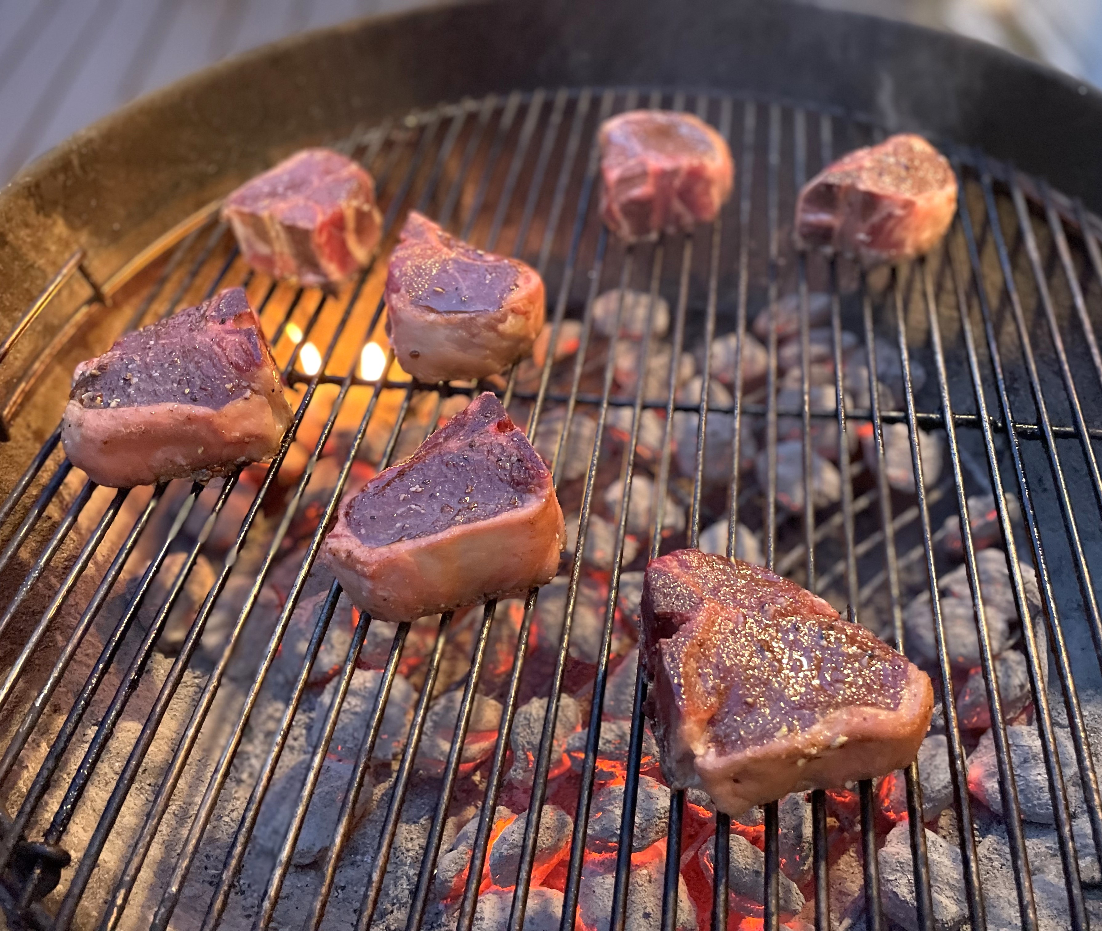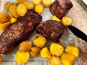 And these dishes are so simple that the delight they offer doesn’t seem fair. I mean, people slave over producing the perfect Hasselbach potato, while I parboil some new potatoes, cut them in half, toss them with olive oil, salt and pepper, spread them across a foil-lined sheet pan and pop them in a 425 F oven for 35 or so minutes and get a wonderfully savory, crisp-skinned potato with a creamy center. If food cost-benefit can be defined as cravability/ effort+time+skill, our oven-crisp potatoes destroy Hasselbach’s on that scale.* Here are those potatoes, nestled beside some steaks: