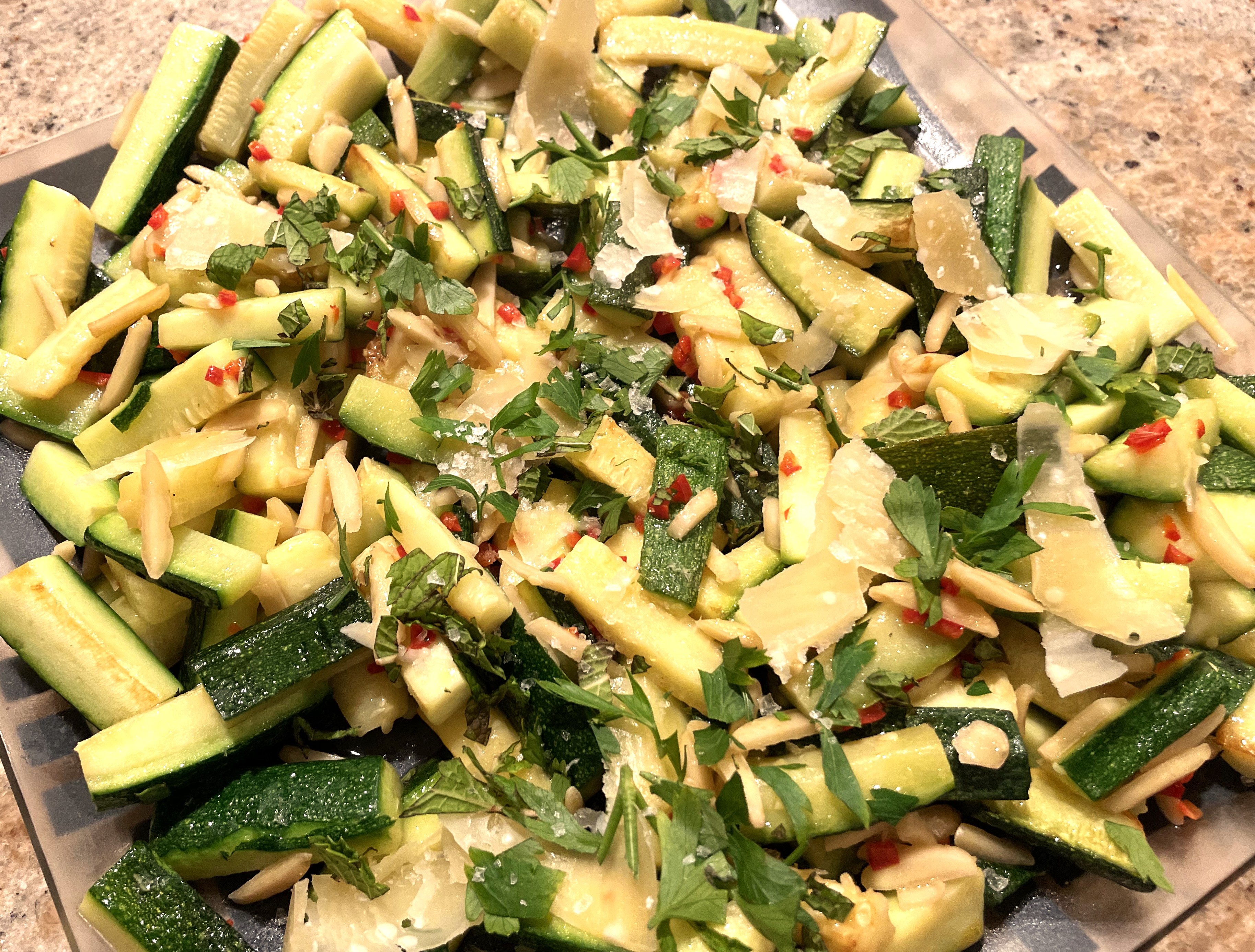 Well, there are little additions – salads, appetizers, sides – that appeal to us as regular go-to parts of our approach to food. Among them are oysters on the half-shell (appetizer), oven-crisp potatoes and our newly-discovered warm zucchini salad with almonds as side-dishes. These little things can make a dinner as bland as turkey burgers memorable.