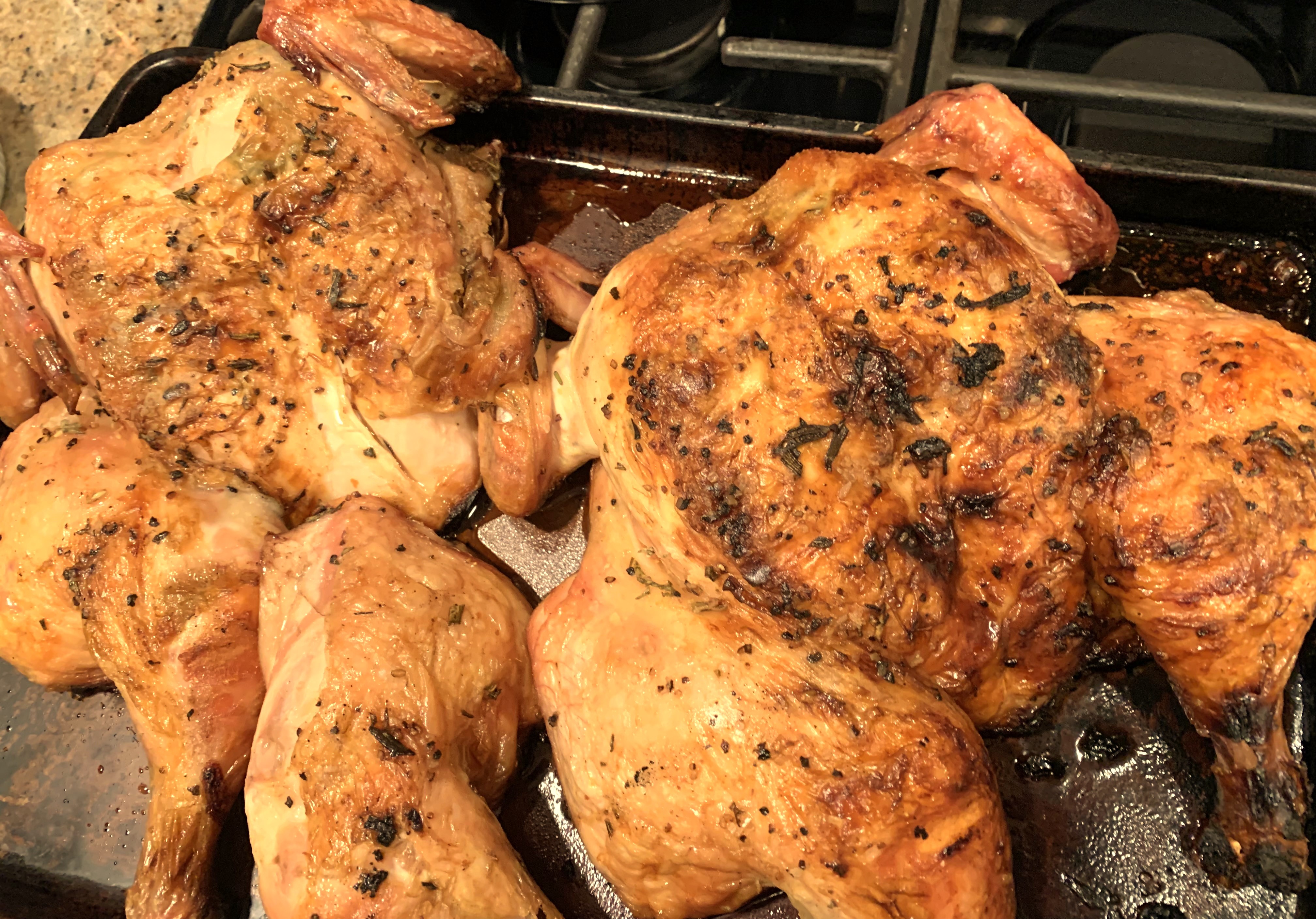 Spatchcock the chicken. With kitchen shears, this is an easy task. With a heavy chef’s knife or a boning knife, it’s more difficult, but doable.