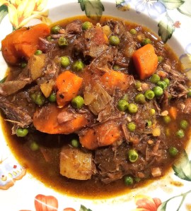 Degrease the stew, if you feel it is necessary, then stir in the carrots and potatoes and bake for another hour, until the vegetables and meat are very tender (test with a fork). Taste and correct seasoning.