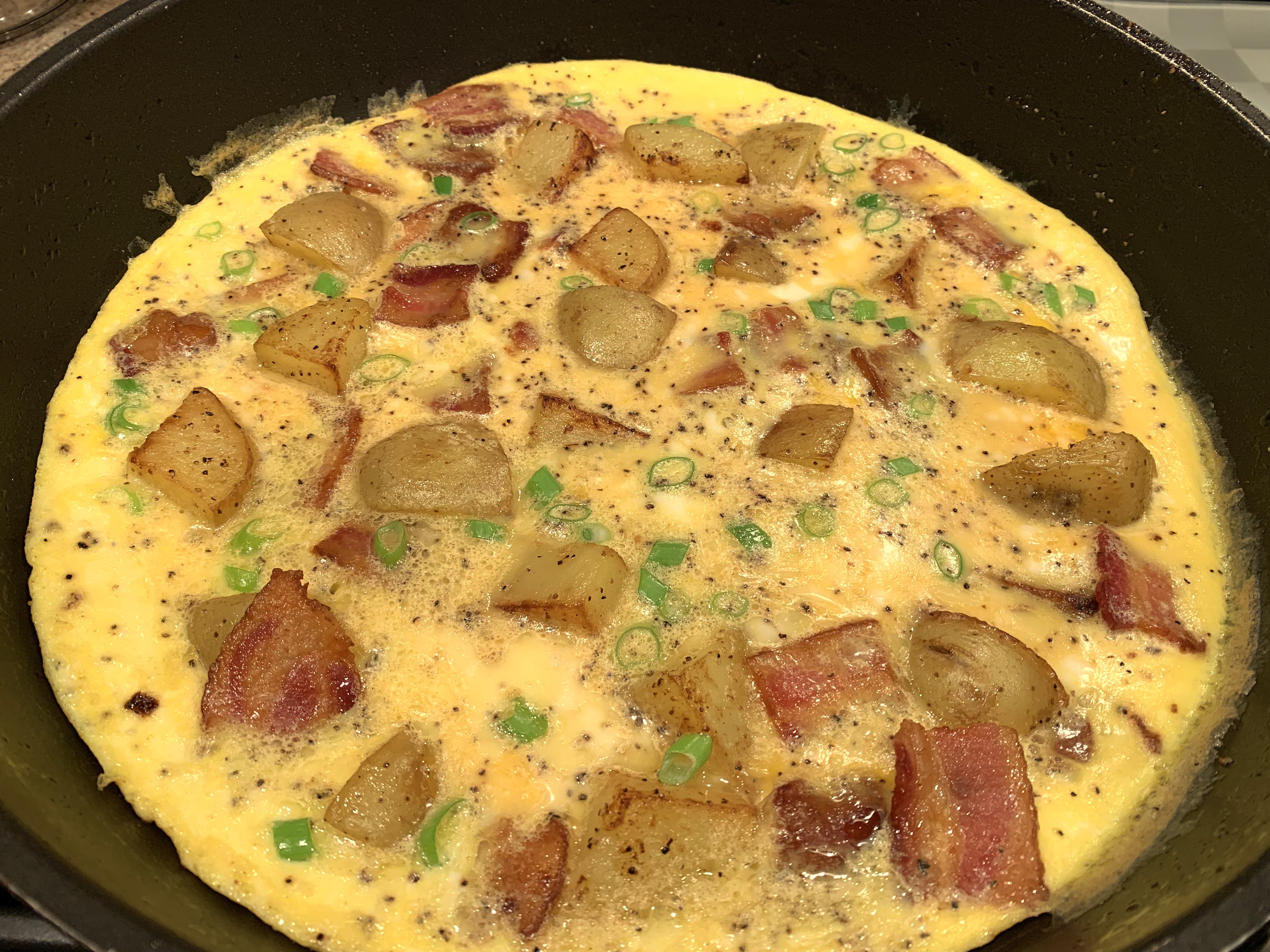 Note: We do not have a 10-inch non-stick omelet pan,but cooked This omelet in a 12-inch non-stick skillet and had to add some eggs to fill the pan, so we added a bit more bacon and a bit more potato as well.