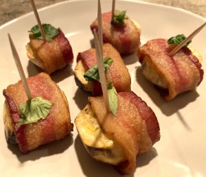 Alas, no picture of the rather shapely meat loaf – but here are some bacon-wrapped plaintains which we had as appetizers
