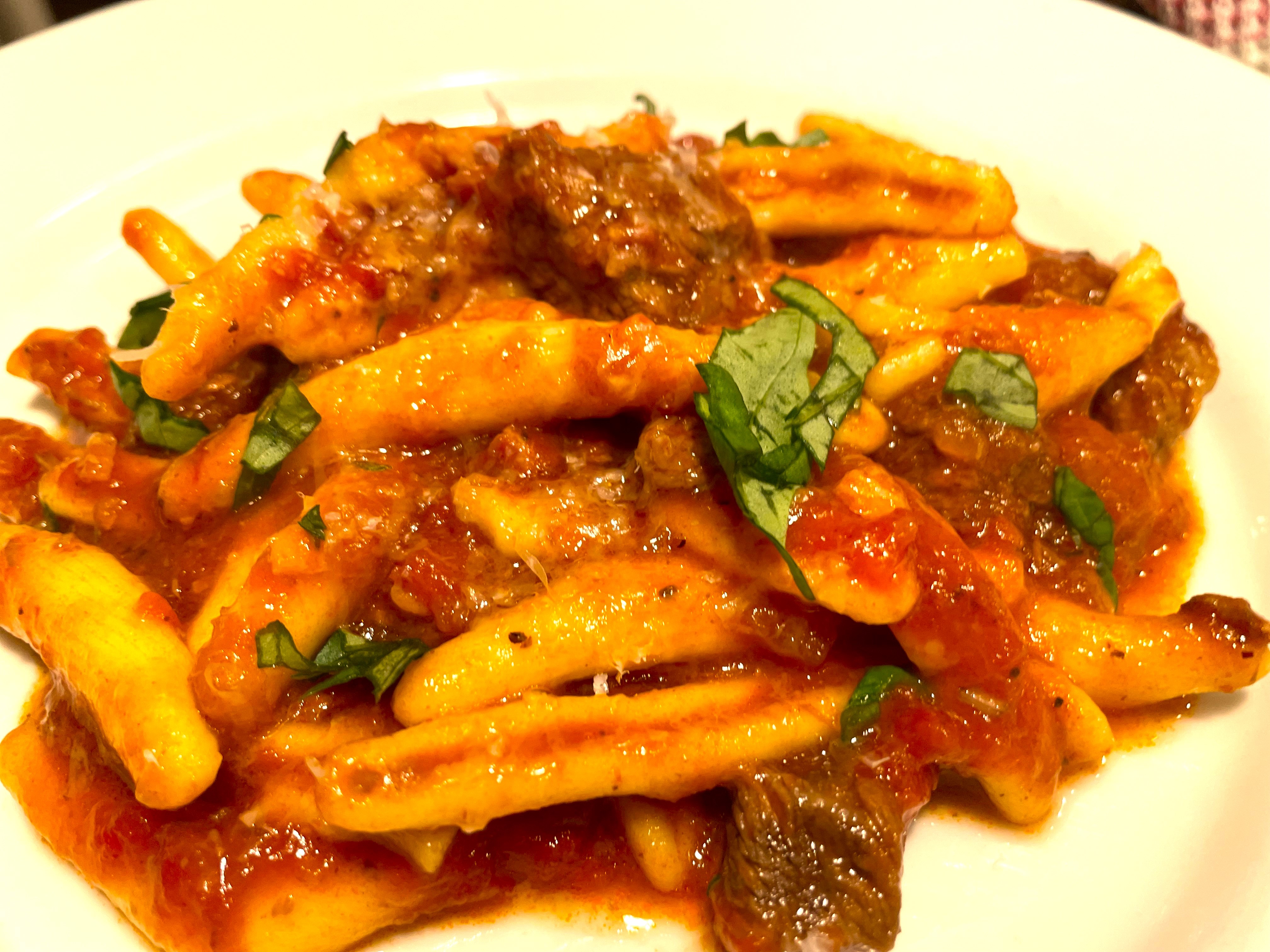 The unusual twist to this gravy/sauce/ragù from Cilentano is that it uses solid, small, chunks of tender short rib. As I read the recipe, I thought that would make it a bit clunky, but it turns out to give a wonderful chew to the whole ensemble. If you are not eating in the same room as Barbara, our family’s dietary monitor, you will not be able to stop eating this week’s dish. Of course, Barbara can only be in one place at a time and it’s amazing how much pasta and sauce can be taken in on a quick trip to the kitchen to refill the wine glasses. (Please don’t tell her about that.)