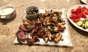 2 pounds boneless, skinless chicken thighs, 1 large red onion, peeled and quartered), ½ cup plus one tablespoon olive oil, 2 lemons juiced, 6 cloves garlic smashed and minced – we used 3 cloves, 1 teaspoon kosher salt, 2 teaspoons ground black pepper