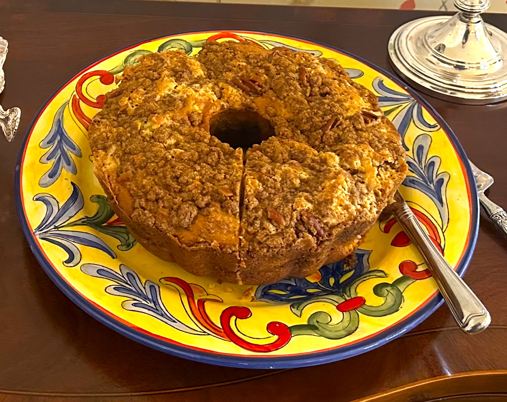 Take care transferring the cake to a platter, streusel side up. (hold a plate over the tube pan, invert the pan and plate and tap the pan, the cake should slide out, and then hold a platter over the plate, invert again and you’ll have the cake, streusel top up, on the platter.