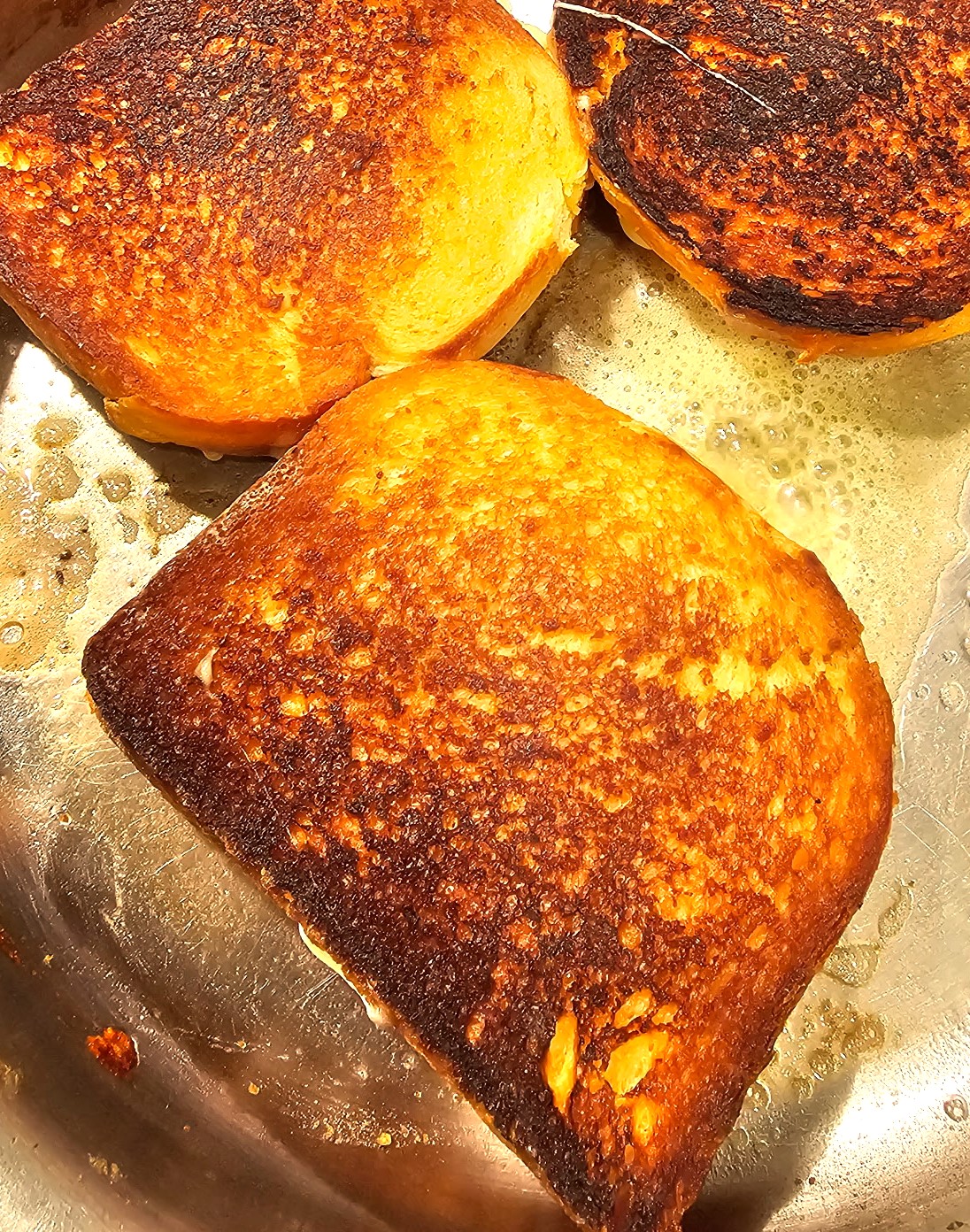 Now heat another tablespoon of butter in a small sauté pan until it sizzles and place the hot dog buns on their sides in the pan and cook over medium-high for 2 minutes on each side, until nicely browned.