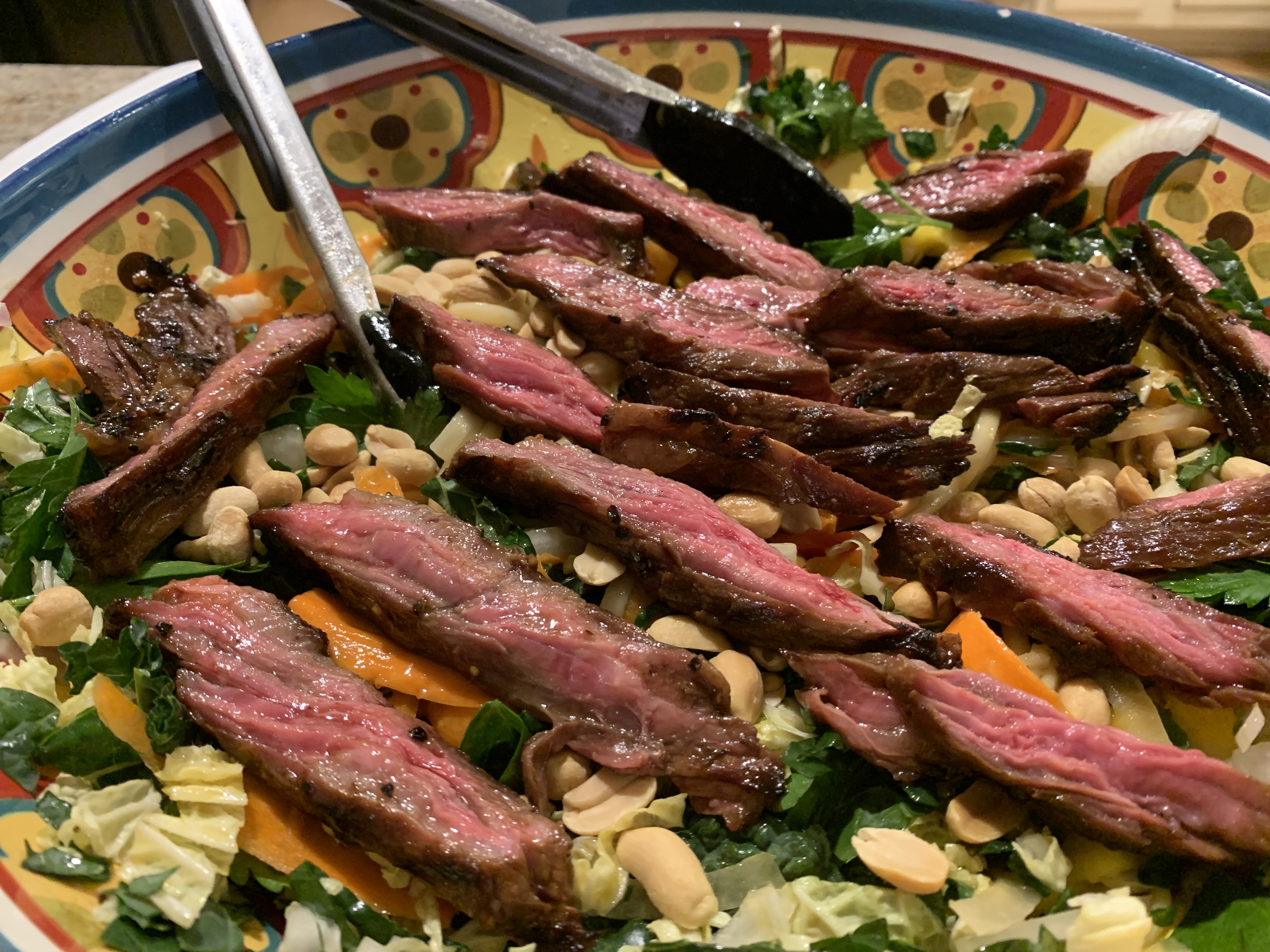 I haven’t warmed up to cold noodles yet, but I’ve begun a journey that may end there.  Our dinner on Sunday combined our red meat approach to life with a Thai-inspired salad and dressing, to create a true fusion of Chinese (origin of Udon noodles and soy sauce), Middle Eastern (toasted sesame oil), Oceanian and Micronesian (ginger), African (peanuts), South American (chili), French (skirt is a kind of bistro steak – beefy but chewy), and modern American (grape seed oil).  It is a curious sign of our times that that you can find all of these ingredients in a typical American supermarket.  And that is astonishing to a seventy-six year old who grew up thinking that chop suey was all that Chinese people ate, that noodles were a German invention, that Oceania was somewhere near the New Jersey Shore and that Micronesia was a tiny insect.  Also, I would have thought it cheap of Mom to give us skirt steak instead of Porterhouse or New York strip.