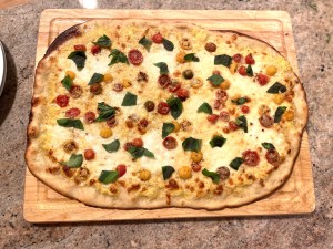 Saturday: Pizza with Roasted Corn Sauce and Tomatoes