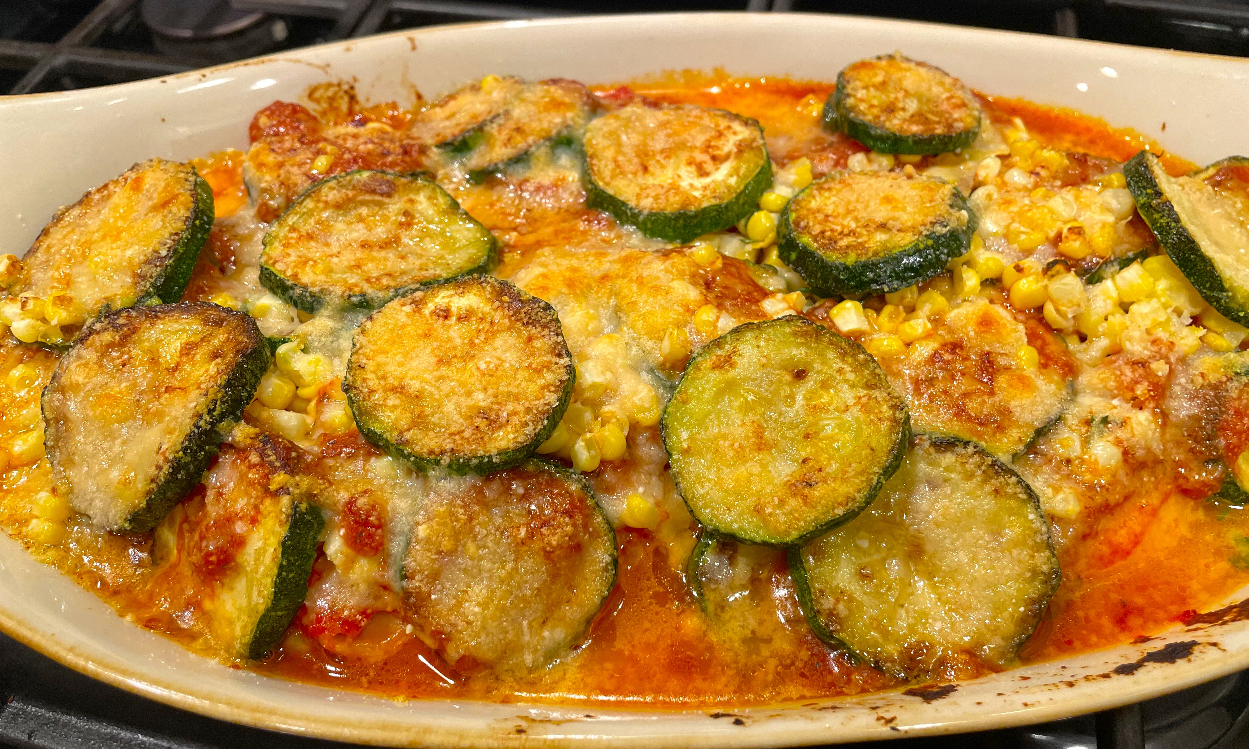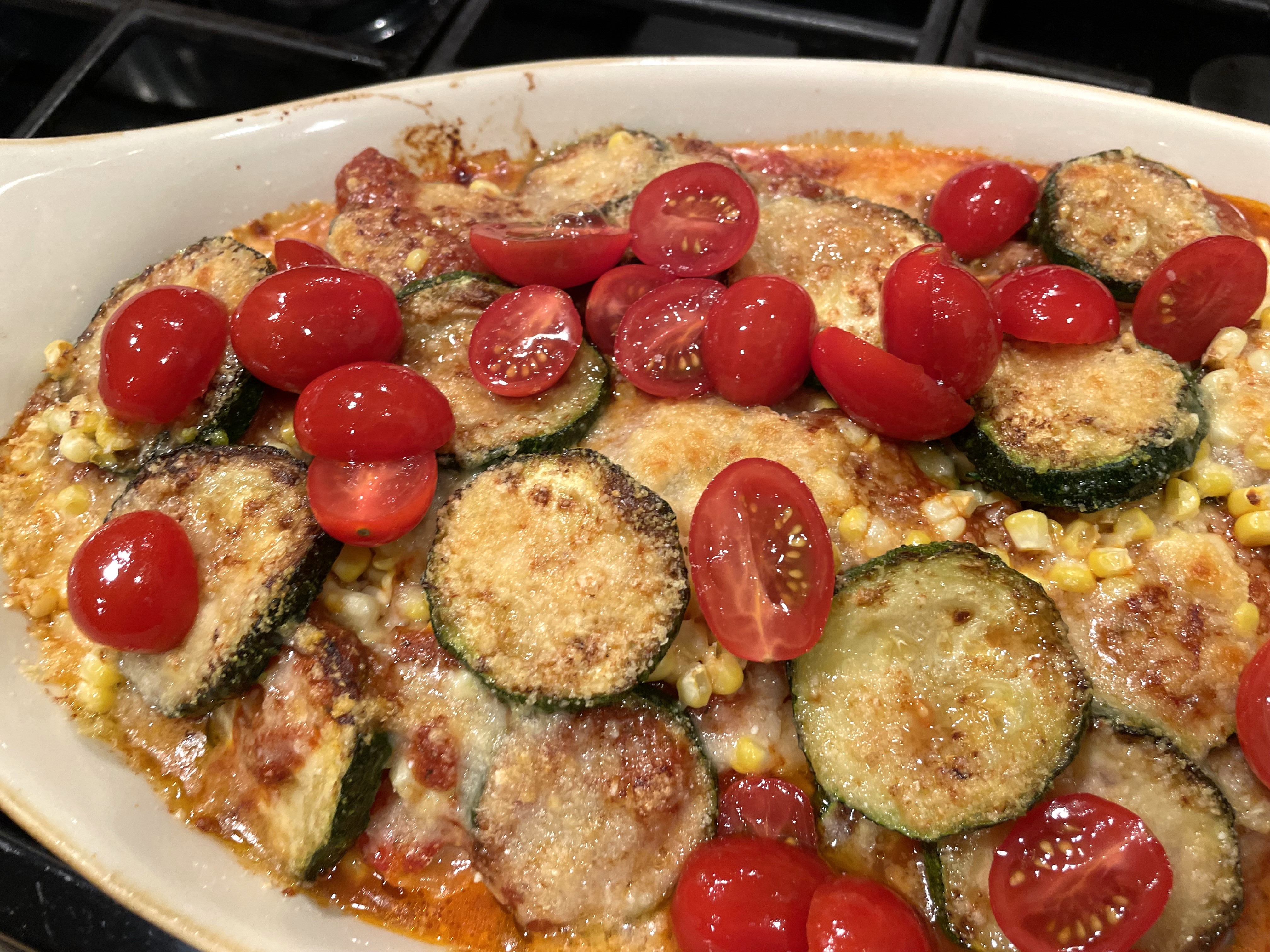 them. Sprinkle the corn over the dish, then shingle the zucchini over the