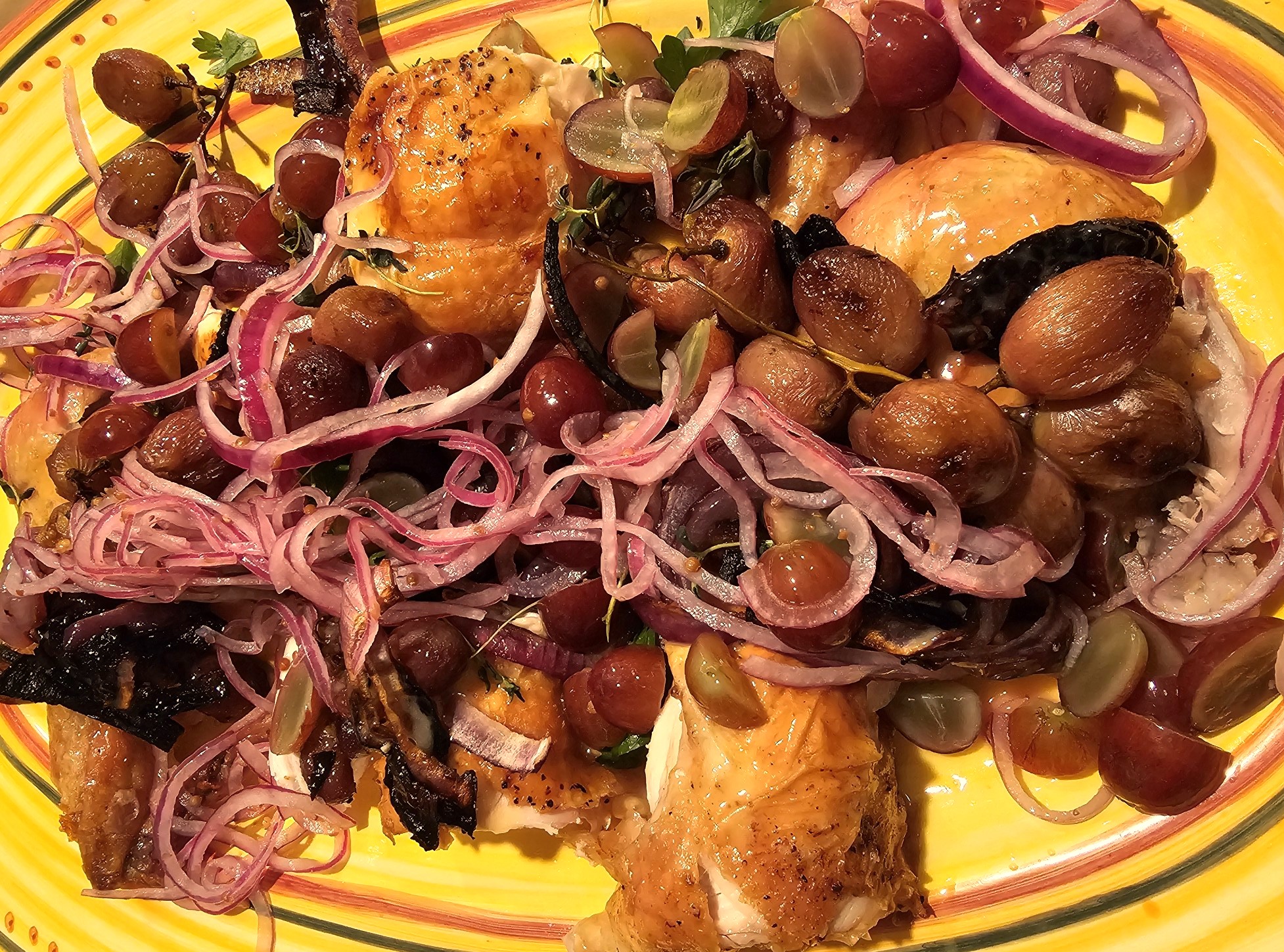 I’m drifting again. After that brief digression on dinosaurs, let me introduce you to the wonderful cook, Melissa Clark, if you don’t already know her. Melissa writes a food column for the New York Times and has written 40 cookbooks. Not one to rest on her laurels, you might say. I’d give her a call and ask if you might drop by to get a few tips on cooking. But for those who are too shy, you’ll find a recipe of hers below which will help you to cook a dinosaur, that is to say a chicken, with grapes and onions and to make a sauce that will satisfy the homo sapiens roaming around your house looking for food. This sauce of cooked grapes and onions with a tinge of vinegar was a revelation to me – my new favorite way to roast chicken.