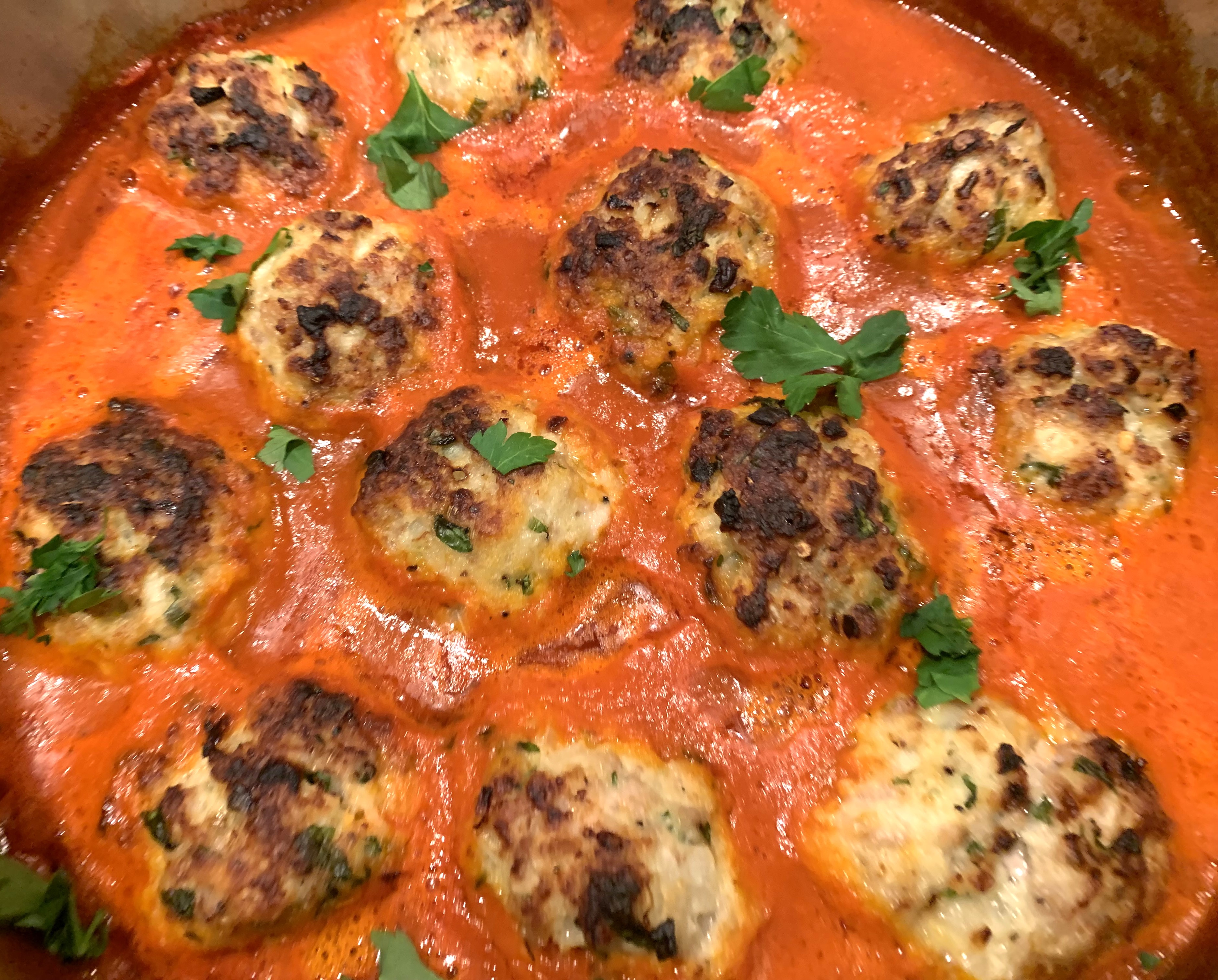 Remove the meatballs from the oven and transfer them to the simmering tomato sauce. If needed, add more water, up to ½ cup, to ensure that all the meatballs are partially submerged. Simmer, stirring occasionally, until the meatballs are cooked through – about 8-10 minutes. Remove from the heat, cover the pan and leave the meatballs in the warm sauce until ready to serve.